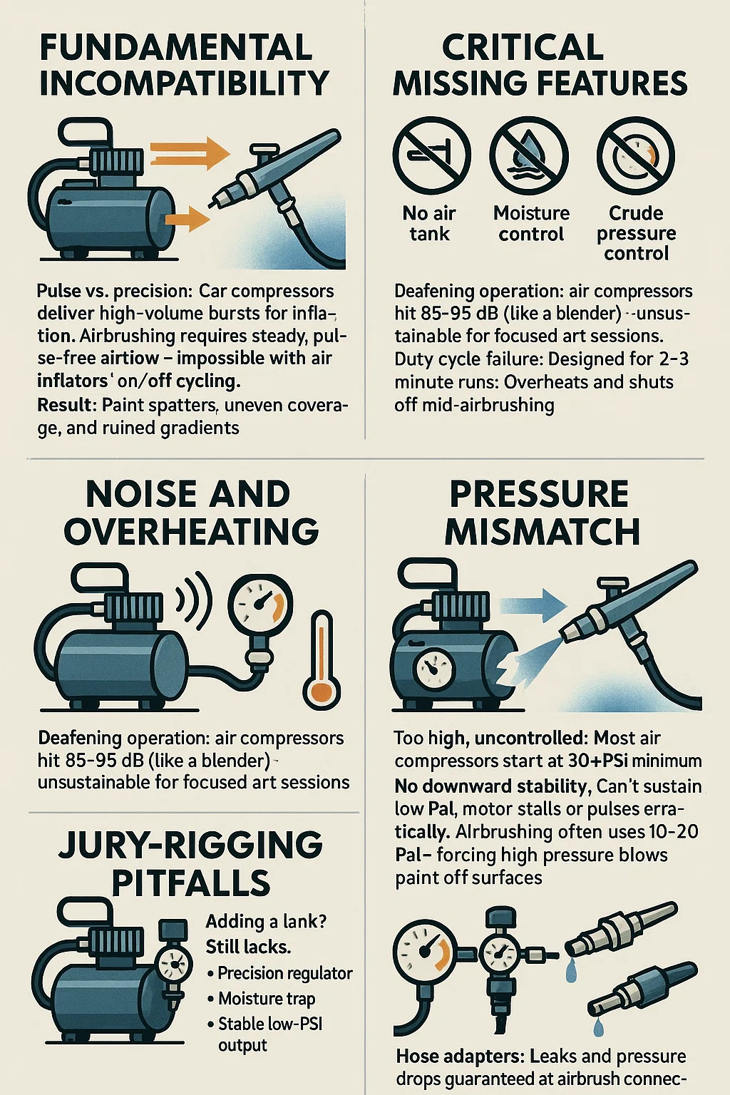 Impuls kontra precyzja: Sprężarki samochodowe wytwarzają impulsy o dużej objętości w celu napełnienia. Aerografowanie wymaga stałego, pozbawionego pulsacji przepływu powietrza – jest to niemożliwe w przypadku cyklicznego włączania i wyłączania pompek powietrza.
