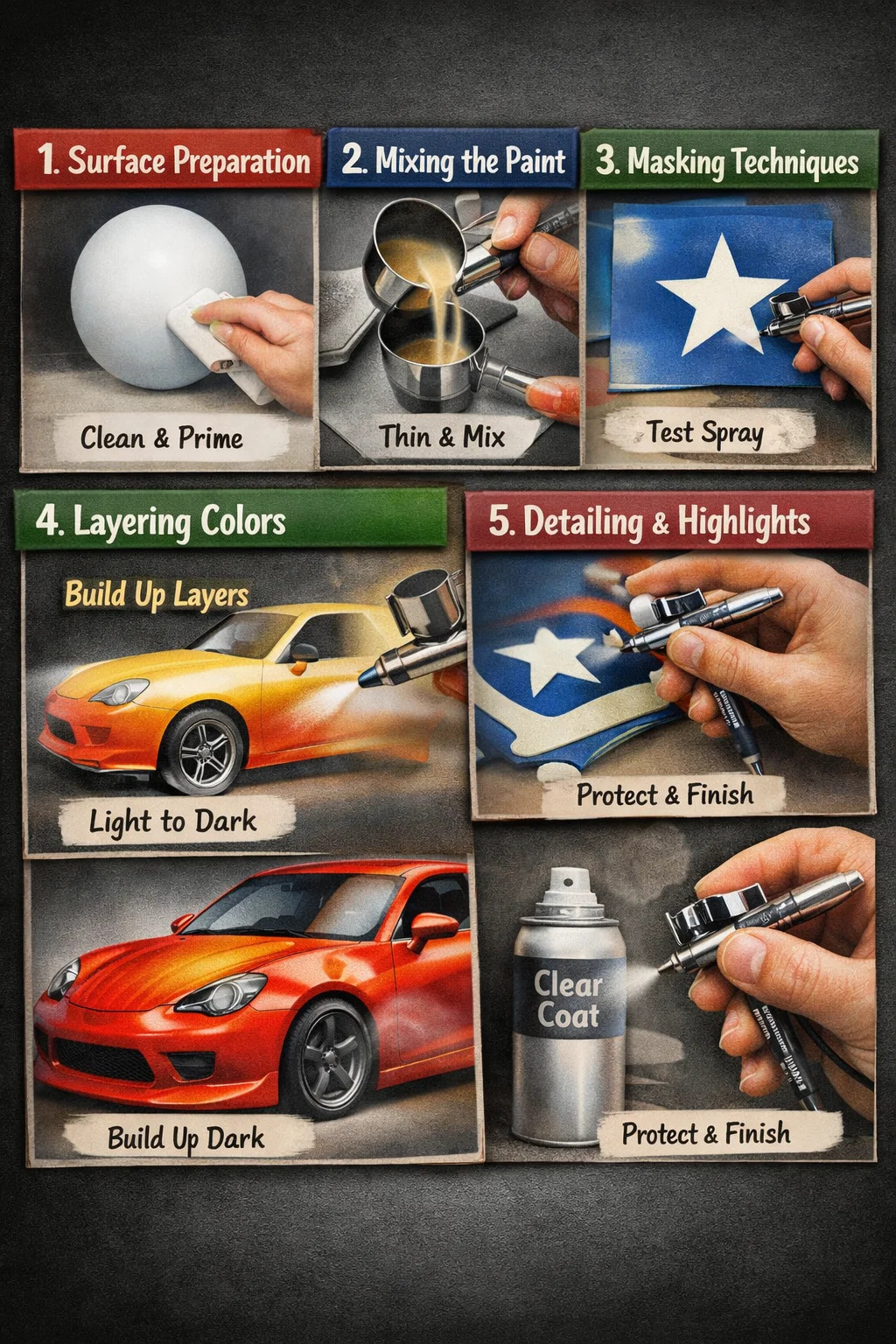 Tworzenie kompletnego obrazu lub grafiki za pomocą aerografu to zasadniczo proces „budowania warstw od jasnych do ciemnych”. Można o tym myśleć jako o „rozpylaniu światła i cienia” na powierzchnię obiektu.